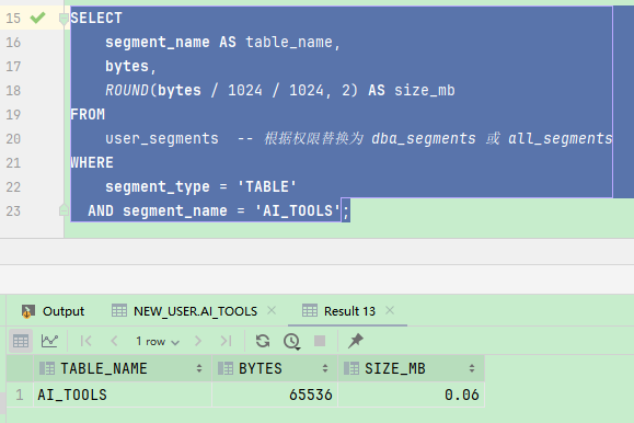 SELECT segment_name AS table_name, bytes, ROUND(bytes / 1024 / 1024, 2) AS size_mb FROM user_segments -- 根据权限替换为 dba_segments 或 all_segments WHERE segment_type = 'TABLE' AND segment_name = 'AI_TOOLS';