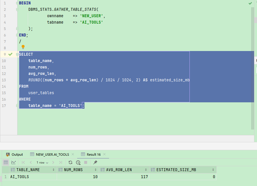 BEGIN DBMS_STATS.GATHER_TABLE_STATS( ownname => 'NEW_USER', tabname => 'AI_TOOLS' ); END; / SELECT table_name, num_rows, avg_row_len, ROUND((num_rows * avg_row_len) / 1024 / 1024, 2) AS estimated_size_mb FROM user_tables WHERE table_name = 'AI_TOOLS';