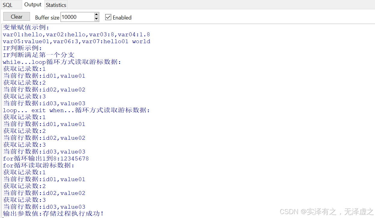 -- while...loop循环方式 dbms_output.put_line('while...loop循环方式:'); OPEN cursor01; -- 打开游标cursor01 var061:=cursor01%ISOPEN; -- 游标是否打开 var062:=cursor01%FOUND; -- 游标是否获取到数据 var063:=cursor01%NOTFOUND; -- 游标是否没有获取到数据 FETCH cursor01 INTO row01; -- 从游标cursor01获取行数据赋给行变量row01,并将游标推进到下一行。 WHILE cursor01%FOUND LOOP --如果cursor01%FOUND结果为真,则执行while循环 BEGIN var_col01 := row01.COL01; -- 获取行变量中的具体字段值赋给左边的变量 var_col02 := row01.COL02; -- 获取行变量中的具体字段值赋给左边的变量 dbms_output.put_line('获取记录数:'||cursor01%ROWCOUNT); -- 输出内容 dbms_output.put_line('当前行数据:'||var_col01||','||var_col02); -- 输出内容 FETCH cursor01 INTO row01; -- 从游标cursor01获取行数据赋给行变量row01,并将游标推进到下一行。 END; END LOOP; CLOSE cursor01; -- 关闭游标cursor01