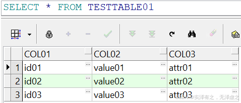 先准备样例表TESTTABLE01,数据如下图,后续所有代码示例查询的数据都来自这个表。