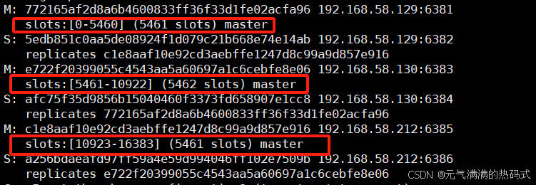 [root@k8s-master01 cluster]# redis-cli -a 111111 --cluster create --cluster-replicas 1 192.168.58.129:6381 192.168.58.129:6382 192.168.58.130:6383 192.168.58.130:6384 192.168.58.212:6385 192.168.58.212:6386 Warning: Using a password with '-a' or '-u' option on the command line interface may not be safe. >>> Performing hash slots allocation on 6 nodes... Master[0] -> Slots 0 - 5460 Master[1] -> Slots 5461 - 10922 Master[2] -> Slots 10923 - 16383 Adding replica 192.168.58.130:6384 to 192.168.58.129:6381 Adding replica 192.168.58.212:6386 to 192.168.58.130:6383 Adding replica 192.168.58.129:6382 to 192.168.58.212:6385 M: 772165af2d8a6b4600833ff36f33d1fe02acfa96 192.168.58.129:6381 slots:[0-5460] (5461 slots) master S: 5edb851c0aa5de08924f1d079c21b668e74e14ab 192.168.58.129:6382 replicates c1e8aaf10e92cd3aebffe1247d8c99a9d857e916 M: e722f20399055c4543aa5a60697a1c6cebfe8e06 192.168.58.130:6383 slots:[5461-10922] (5462 slots) master S: afc75f35d9856b15040460f3373fd658907e1cc8 192.168.58.130:6384 replicates 772165af2d8a6b4600833ff36f33d1fe02acfa96 M: c1e8aaf10e92cd3aebffe1247d8c99a9d857e916 192.168.58.212:6385 slots:[10923-16383] (5461 slots) master S: a256bdaeafd97ff59a4e59d994046ff102e7509b 192.168.58.212:6386 replicates e722f20399055c4543aa5a60697a1c6cebfe8e06 Can I set the above configuration? (type 'yes' to accept): yes >>> Nodes configuration updated >>> Assign a different config epoch to each node >>> Sending CLUSTER MEET messages to join the cluster Waiting for the cluster to join . >>> Performing Cluster Check (using node 192.168.58.129:6381) M: 772165af2d8a6b4600833ff36f33d1fe02acfa96 192.168.58.129:6381 slots:[0-5460] (5461 slots) master 1 additional replica(s) S: afc75f35d9856b15040460f3373fd658907e1cc8 192.168.58.130:6384 slots: (0 slots) slave replicates 772165af2d8a6b4600833ff36f33d1fe02acfa96 S: 5edb851c0aa5de08924f1d079c21b668e74e14ab 192.168.58.129:6382 slots: (0 slots) slave replicates c1e8aaf10e92cd3aebffe1247d8c99a9d857e916 M: e722f20399055c4543aa5a60697a1c6cebfe8e06 192.168.58.130:6383 slots:[5461-10922] (5462 slots) master 1 additional replica(s) S: a256bdaeafd97ff59a4e59d994046ff102e7509b 192.168.58.212:6386 slots: (0 slots) slave replicates e722f20399055c4543aa5a60697a1c6cebfe8e06 M: c1e8aaf10e92cd3aebffe1247d8c99a9d857e916 192.168.58.212:6385 slots:[10923-16383] (5461 slots) master 1 additional replica(s) [OK] All nodes agree about slots configuration. >>> Check for open slots... >>> Check slots coverage... [OK] All 16384 slots covered. [root@k8s-master01 cluster]# ll total 52 drwxr-xr-x. 2 root root 4096 Dec 1 15:30 appendonlydir -rw-r--r--. 1 root root 10718 Dec 1 15:50 cluster6381.log -rw-r--r--. 1 root root 15205 Dec 1 15:50 cluster6382.log -rw-r--r--. 1 root root 171 Dec 1 15:49 dump6382.rdb -rw-r--r--. 1 root root 799 Dec 1 15:49 nodes-6381.conf -rw-r--r--. 1 root root 811 Dec 1 15:49 nodes-6382.conf -rw-r--r--. 1 root root 347 Dec 1 15:32 redisCluster6381.conf -rw-r--r--. 1 root root 346 Dec 1 15:32 redisCluster6382.conf