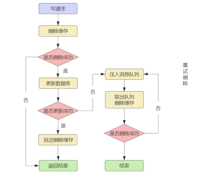 在上面的延迟双删方案中,如果我们思考,其实还是有诸多问题的。比如:在延迟双删的读写场景中,如果第二次缓存删除失败了,同样会出现一致性问题。那么删除失败了,重试几次不就好了吗?基于这个思想我们进一步引入了重试删除方案来解决