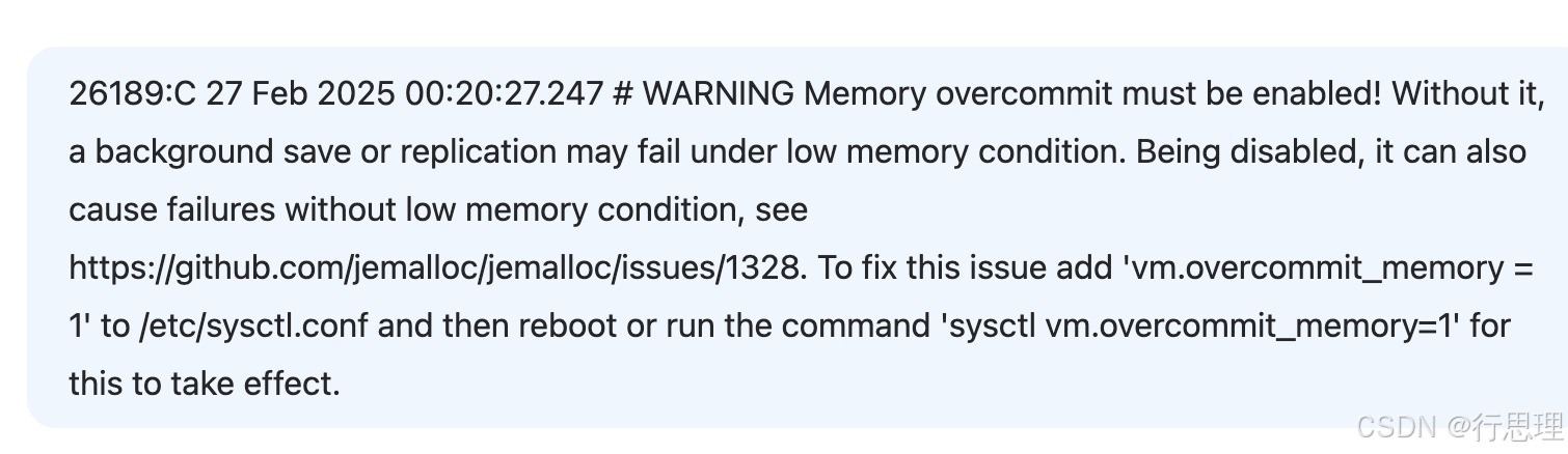 26189:C 27 Feb 2025 00:20:27.247 # WARNING Memory overcommit must be enabled! Without it, a background save or replication may fail under low memory condition. Being disabled, it can also cause failures without low memory condition, see https://github.com/jemalloc/jemalloc/issues/1328. To fix this issue add 'vm.overcommit_memory = 1' to /etc/sysctl.conf and then reboot or run the command 'sysctl vm.overcommit_memory=1' for this to take effect.