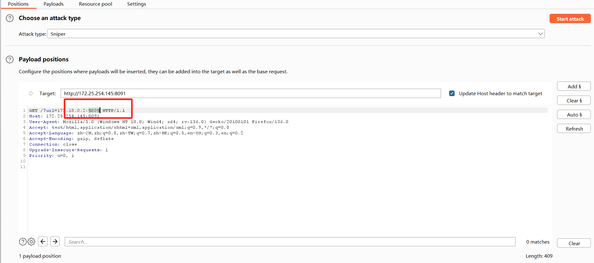 说明172.17.0.2是内网中存活的另一台主机,并且上面也运行着http服务。但是当前还不能找到攻下这台内网主机的突破口,我们可以使用ssrf扫描一下这个内网主机的端口,这里使用burpsuite: