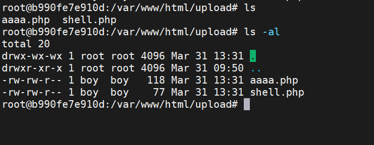 执行它,同样也在docker下的/var/www/html/upload生成了aaaa.php文件