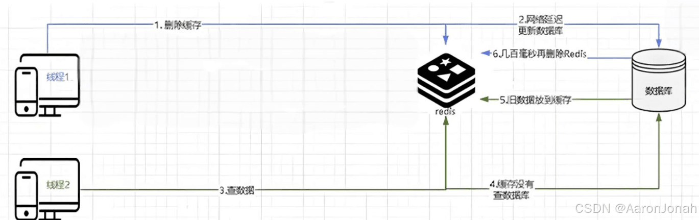 通过(6)步延迟一段时间后再进行redis的删除,在并发读写情况下保证redis与数据库数据一致性。具体延迟多长时间,需评估项目读数据业务逻辑耗时(即线程2从数据库读取数据到更新缓存成功的时间)。确保查询请求结束,更新请求可以删除查询请求造成的缓存脏数据。