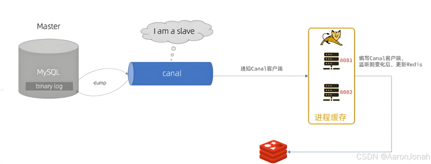 通过canal组件订对binlog日志进行订阅,模仿数据库的slave数据库的备份请求,使得redis缓存数据删除,保证redis与数据库数据一致性。