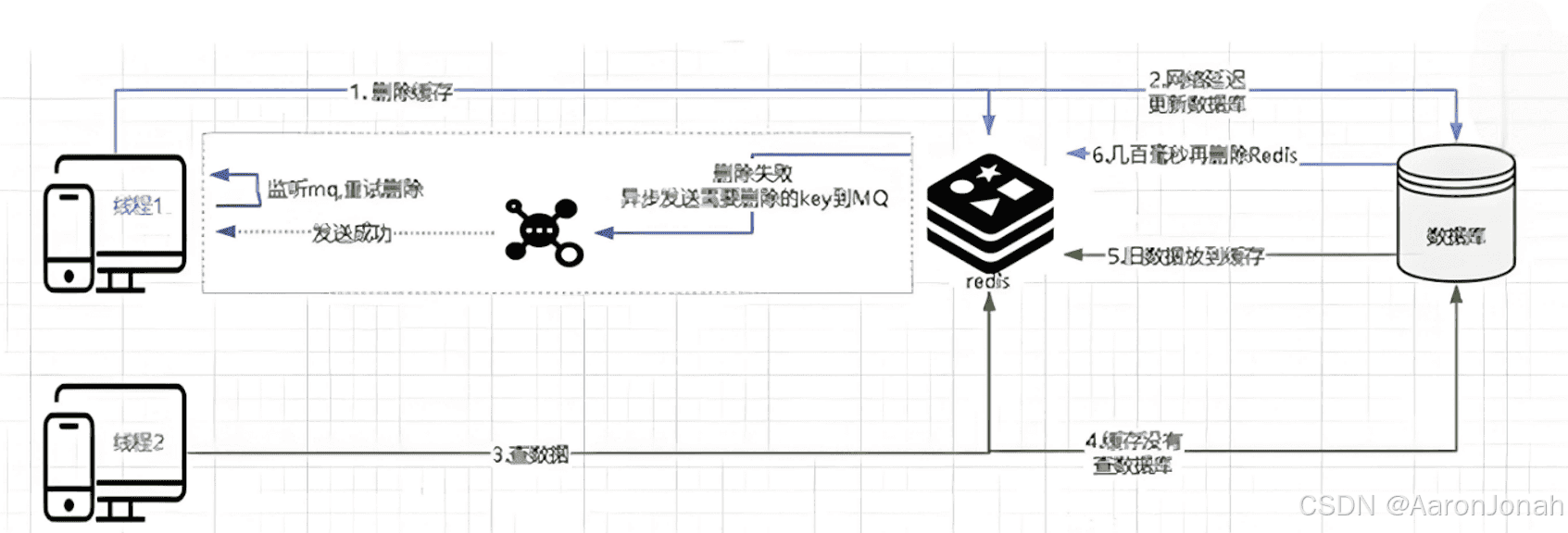 通过(6)步延迟删除缓存数据时,删除时失败,缓存中存储的还是脏数据(旧数据)。线程1的应用作为producer异步发送需要删除key到MQ。线程1的应用监听MQ,重试删除操作。