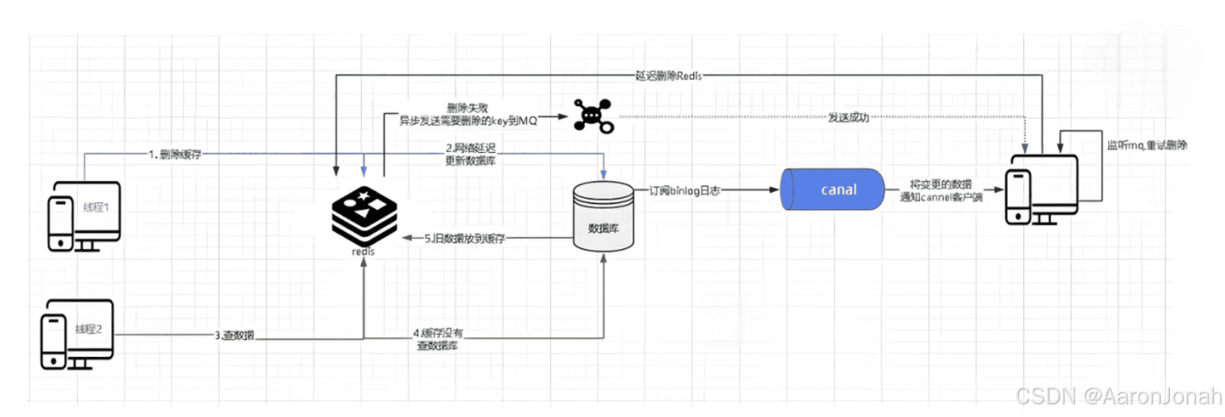 数据库更新后,canal订阅binlog日志,将变更的数据发送消息通知给java客户端(spring boot项目)。java客户端执行延迟删除缓存,若删除失败,java客户端作为producer异步发送需要删除key的MQ消息进行重试。客户端监听MQ消息,执行重试删除缓存操作。