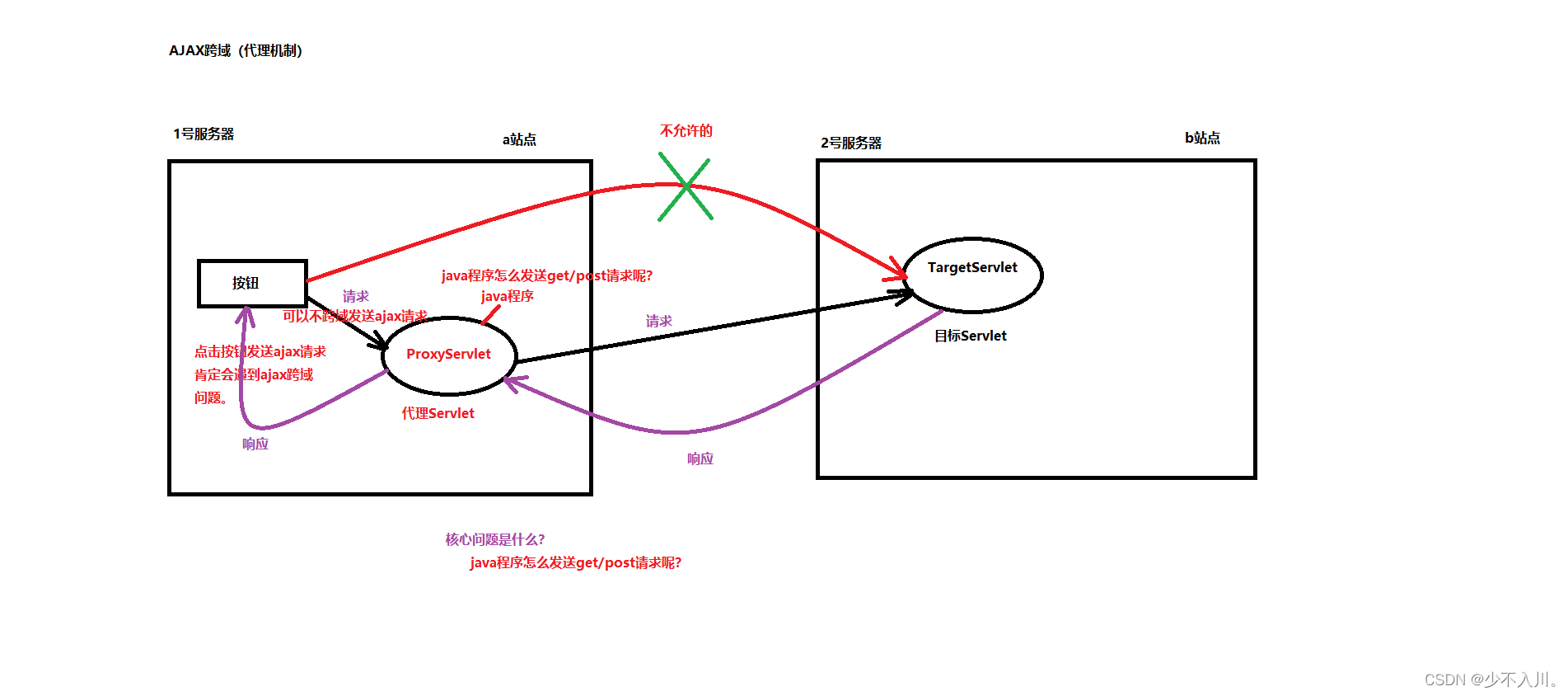 下面例子都是部署在两个服务器上,html代码是a服务器上的内容,servlet是b服务器上的内容。