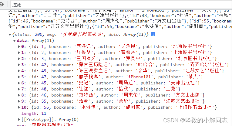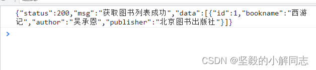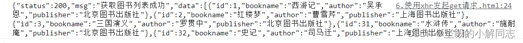 var xhr = new XMLHttpRequest(); xhr.open('get', 'http://www.liulongbin.top:3006/api/getbooks'); xhr.send(); xhr.onreadystatechange = function () { if (xhr.readyState === 4 && xhr.status === 200) { console.log(xhr.responseText); var restr = JSON.parse(xhr.responseText) console.log(restr); } }