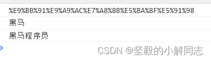 let str = '黑马程序员'; let str2 = encodeURI(str) console.log(str2); //utf-8一个汉字占三个字节 ,写六个是黑马两个字。 let str3 = decodeURI('%E9%BB%91%E9%A9%AC') let str4 = decodeURI(str2) console.log(str3); console.log(str4);