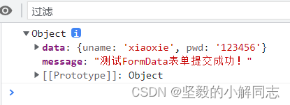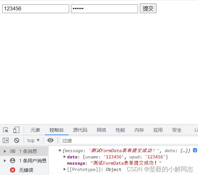var form = document.querySelector('#form1') form.addEventListener('submit', function (e) { e.preventDefault(); //创建对象,获取数据。 let fd = new FormData(form); let xhr = new XMLHttpRequest(); xhr.open('post', 'http://www.liulongbin.top:3006/api/formdata') xhr.send(fd) xhr.onreadystatechange = function () { if (xhr.readyState === 4 && xhr.status === 200) { console.log(JSON.parse(xhr.responseText)); } } })