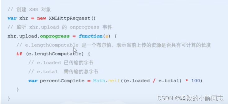//监听上传进度 xhr.upload.onprogress = function (e) { if (e.lengthComputable) { let uploadProgroess = Math.ceil((e.loaded / e.total) * 100) console.log(uploadProgroess); } }