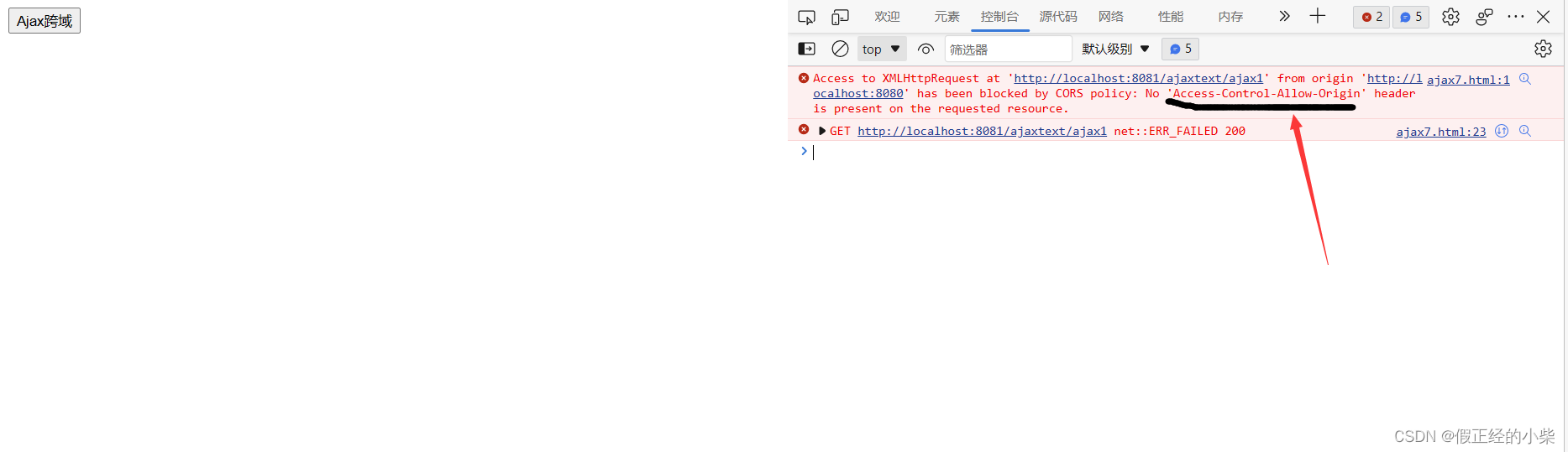 下面是使用AJAX发送请求跨域访问资源出现的问题:请求的资源上不存在“访问控制允许源”标头:(就是被同源策略阻止了)