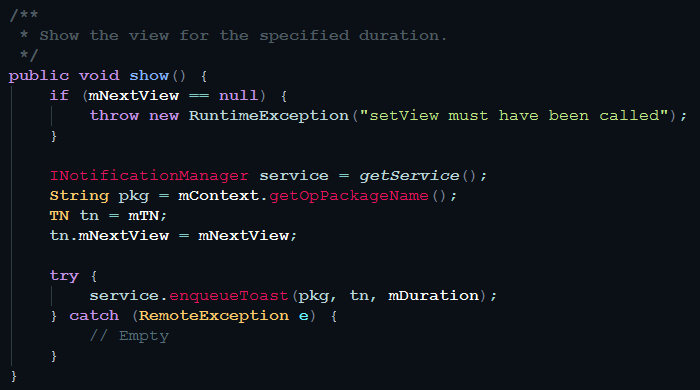 自定义Toast的java代码逻辑主要模仿系统Toast的makeText() 、show()两个方法,此外还需要reset()方法,实现Toast显示过程中Activity切换时context也随之切换,关键代码如下: