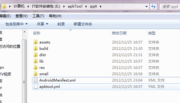 将apk解包 命令行下cd到E:\apkTool这个目录 apktool d qq4.o.apk qq4 将apk解包到qq4(这个也可以随意)这个目录