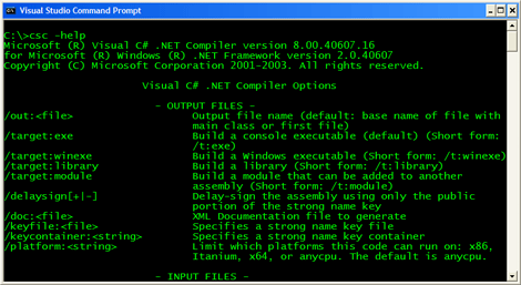 尽管本文没有提供有关 csc.exe 的每个选项的全部详细信息,但我希望您能够方便地使用 Visual Studio 2005 文档了解其余标志。