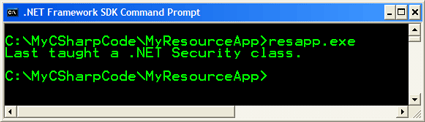 因为我尚未指定 /out 标志,所以在该示例中,我们的可执行文件的名称将基于定义了 Main() 的文件 resApp.exe。如果一切正常,则在执行以后,您应当发现类似于图 11 的输出。