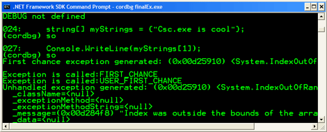 注 本文的重点不是解释 .NET 调试工具的用法。如果您希望了解有关在命令行进行调试的过程的更多信息,请在 Visual Studio 帮助系统内查找“cordbg.exe”。