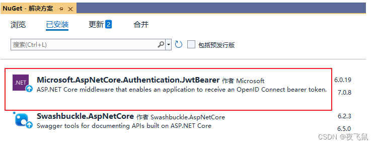 采用JWT进行身份验证,需要安装【Microsoft.AspNetCore.Authentication.JwtBearer】,可通过Nuget包管理器进行安装,如下所示: