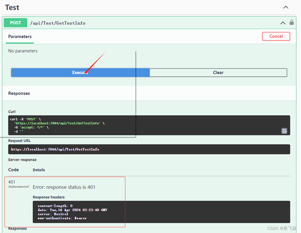 如果清除掉Token配置,再进行访问/api/Test/GetTestInfo接口,则会返回401未授权信息,如下所示: