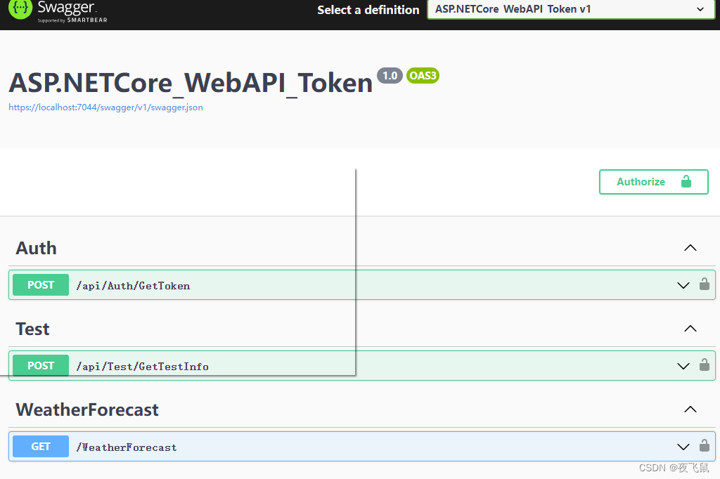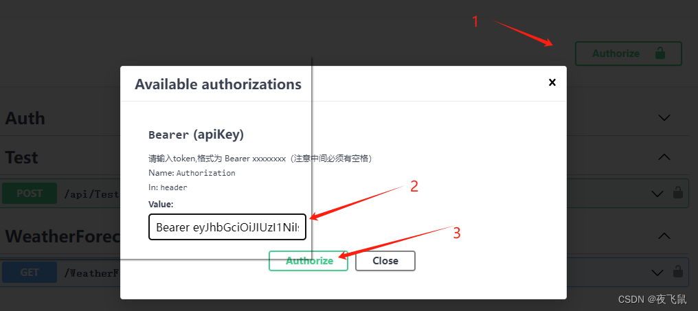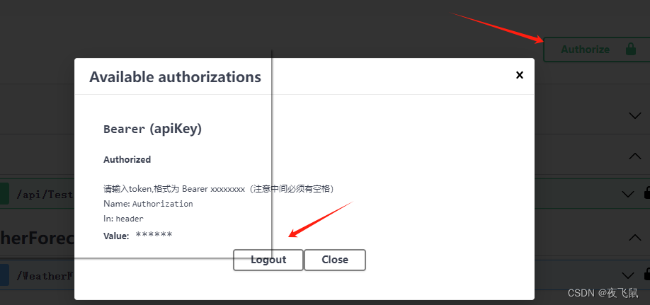 2. 设置Token在Swagger上方,点击Authorize,弹出身份验证配置窗口,如下所示: