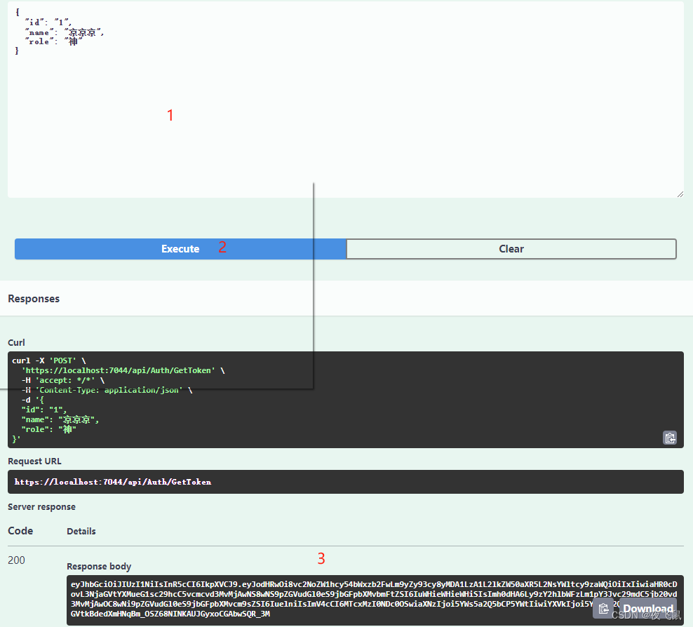 1. 获取Token运行api/Auth/GetToken接口,输入用户信息,点击Execute,在返回的ResponseBody中,就可以获取接口返回的Token