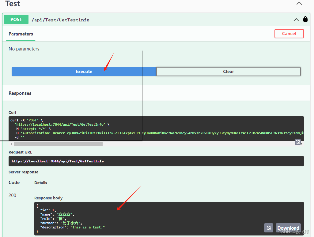 3. 接口测试配置好身份认证信息后,调用/api/Test/GetTestInfo接口,获取信息如下: