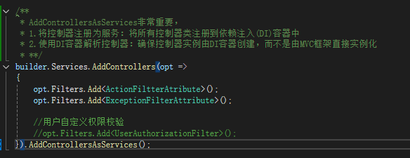 .AddControllersAsServices(); // 这很重要,确保控制器由DI容器解析