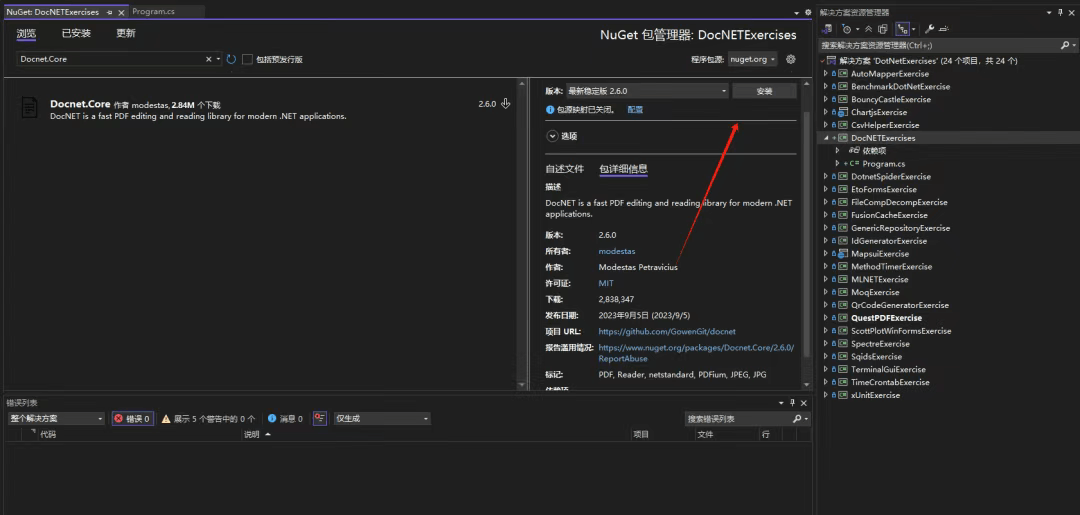 在 NuGet 包管理器中搜索 Docnet.Core 安装: