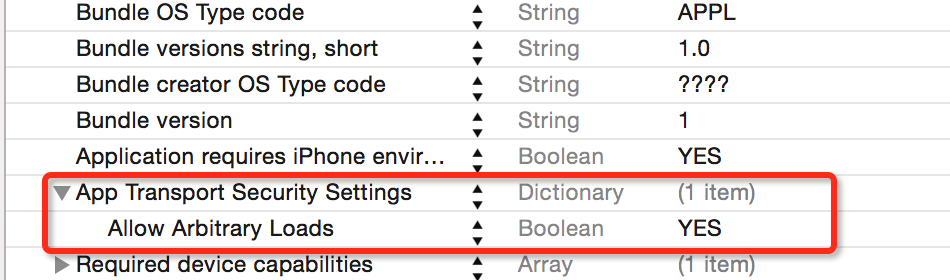 6、iOS9中新增App Transport Security(简称ATS)特性, 主要使到原来请求的时候用到的HTTP,都转向TLS1.2协议进行传输。这也意味着所有的HTTP协议都强制使用了HTTPS协议进行传输。需要在Info.plist新增一段用于控制ATS的配置: