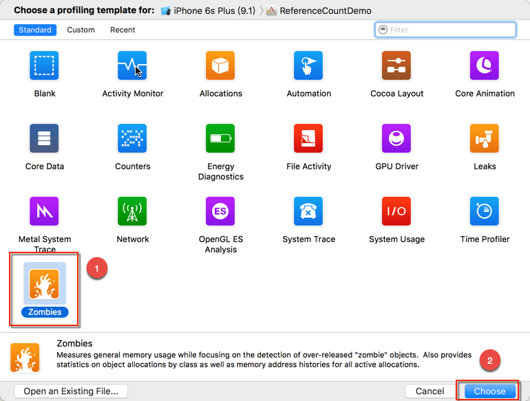 也可以通过选择「Product」下的「Profile」来打开「Instruments」工具集。然后选择「Zombies」,再单击右下角的「Choose」按钮进入检测界面,这时点击左上角的「Record」红色圆点按钮开始检测。