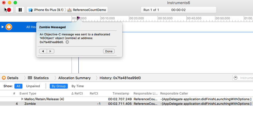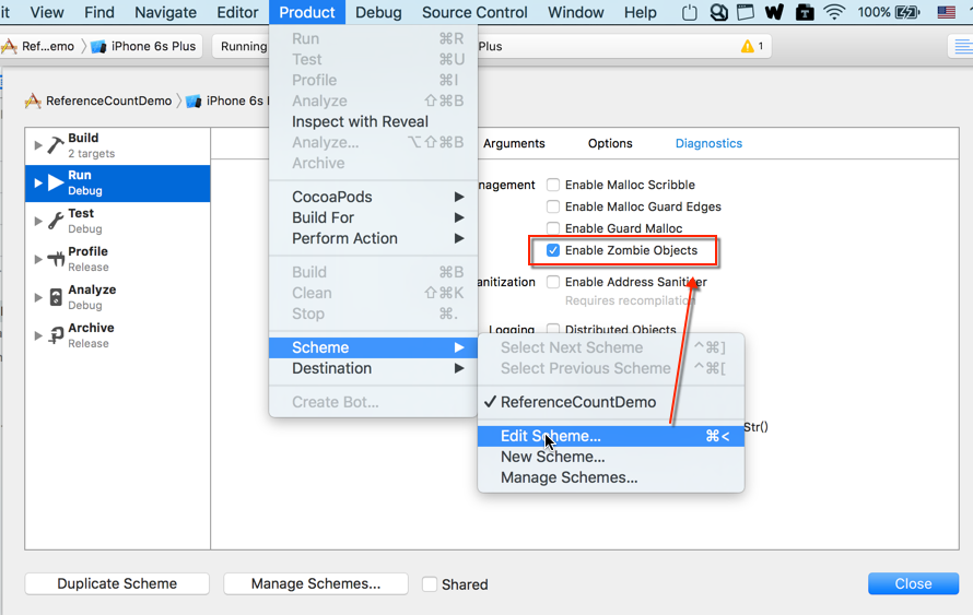 Xcode 默认不会监控僵尸对象,这里我们配置开启他,然后就可以看到具体的跟踪信息了: