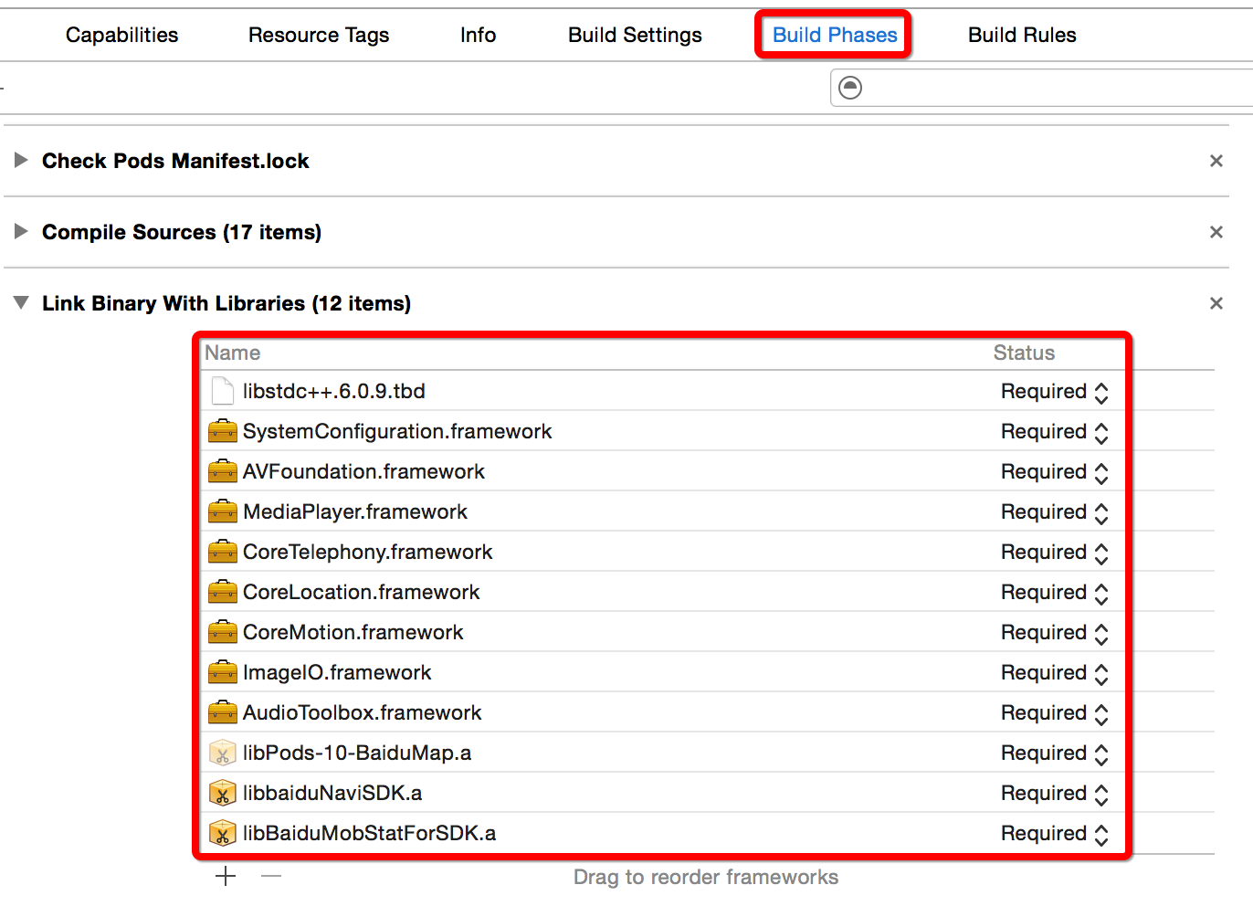 将AudioToolbox.framework、ImageIO.framework、CoreMotion.framework、CoreLocation.framework、CoreTelephony.framework、MediaPlayer.framework、AVFoundation.framework、SystemConfiguration.framework、libstdc++6.0.9.dylib这几个framework添加到工程中。