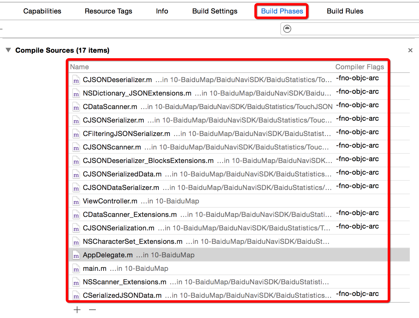 第三步:将TouchJSON库设置为非ARC编译选项,也就是在 Compile Sources 中设置编译方式为:-fno-objc-arc