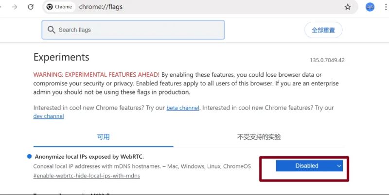 3、例如:在谷歌浏览器中的进入chrome://flags/地址将enable-webrtc-hide-local-ips-with-mdns的值为Disabled,才可以使用
