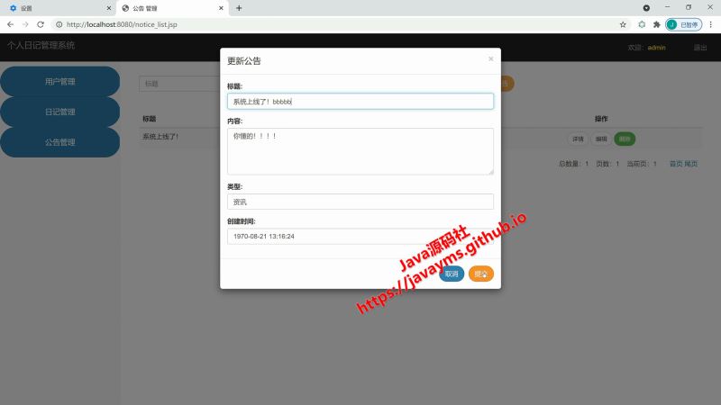 登录、注册、退出、用户模块、公告模块、日记模块的增删改查管理