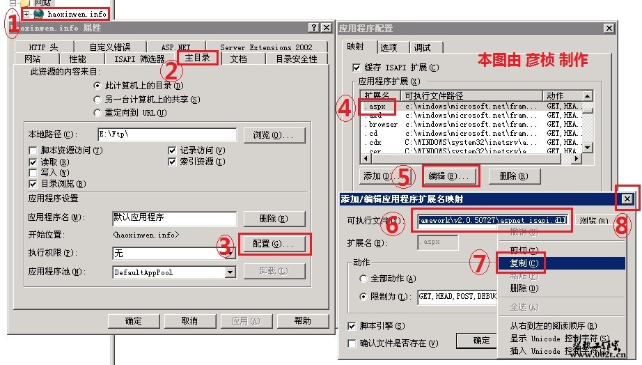 3.如右侧窗口,找到 .aspx 扩展名——》编辑——》复制 可执行文件的路径——》关闭