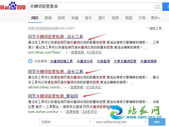 查询关键词密度可以通过网络在线工具,用百度搜索“关键词密度查询”。比如,打开“网页关键词密度检测一站长工具”网页,在“关键字”搜索框中输入“互联网”,在“网站地址”搜索框中输入要查询的网址,再单击“查询”按钮,可以看到如图所示的查询结果。关键词“互联网”出现的频率是20次,该页面共有9634个字符,关键词“互联网”出现的字符数是66,占该页面的0.7%,即关键词密度是0.7%。