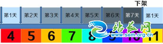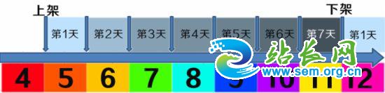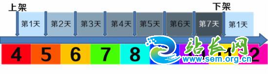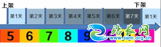 上图中,在天数里填充的颜色越深说明权重越高,排名越靠前。如果我们10号晚上24点下架的话,宝贝最高权重点在10号白天,这段时间我们如果能抢到好的排名,是可以让那些有欲望购物、正在提前搜索,想确定购物清单的顾客看到我们。这样我们可以抢夺先机,提前占据顾客的大脑。