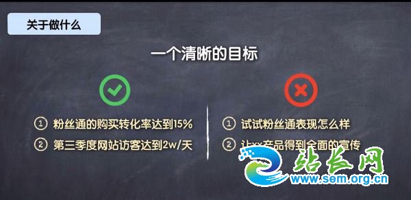 【我们做方案的时候要有一个清晰的目标,清晰的目标会有一条明确的时间线和有一个可以计量的数据结果】我们看看,左侧是2个清晰的方案目标,(粉丝通的购买转化率应达到15%,这个目标前要加个时间点,我们就说8月份吧)有时间点,有具体的结果。而右侧则是2个含糊不清的目标,比如让xx产品得到全面的宣传,什么叫全面的?请问什么叫全面的?如果是这样的一个含糊的目标,我又怎么去分解这样的一个目标呢?分解我的工作步骤呢?根本就无法分解,所以就导致你做的每一件事情都没有目的性。