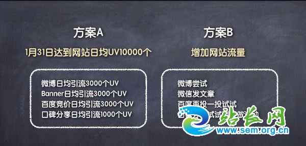 这是两个不同的方案:方案A 与方案B ,方案A 的目标是【1月31日达到网站日均UV(独立访客)1000个】这是一个明确的目标,有时间线,有可测量的数字结果。方案B的目标是【增加网站流量】,这是一个不合格的目标。