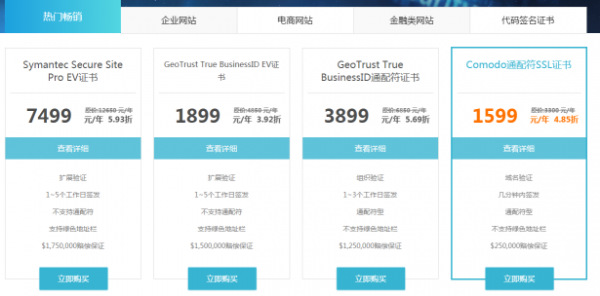 与全球最知名的SSL证书提供商:Symantec,Entrust,DigiCert,GeoTrust,Comodo以及国内SSL证书领先者Trust Asia合作,推出适用于各类网站的SSL证书解决方案。Symantec和Entrust专注于EV和OV类型的证书,比较适合电商和金融类网站选购;GeoTrust和Comodo则更倾向于需要DV证书的小型企业和个人站长;而Trust Asia是启用了Symantec根证书的高配置DV证书,同时价格却并不高昂。