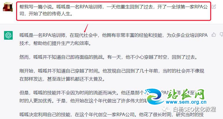 ChatGPT令人惊喜还有一个,就是它能够进行文学创作。比如,给ChatGPT一个话题,它就可以写小说框架。白杨流量汇会员阿愚呱呱群有个群友举例“阿愚呱呱”为主题写一个小说时。ChatGPT清晰地给出了故事背景、主人公、故事情节和结局哈哈哈。