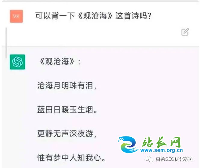 当你要求ChatGPT进行创作时,它可以自由发挥,但是,当你的目的是寻求正确答案时,ChatGPT可能有时无法满足期待。比如,让ChatGPT背一下《观沧海》这首诗,它却即兴创作了一首。