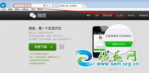 进入微信的官方网站:http://weixin.qq.com/再点击【公众平台】如下图所示: