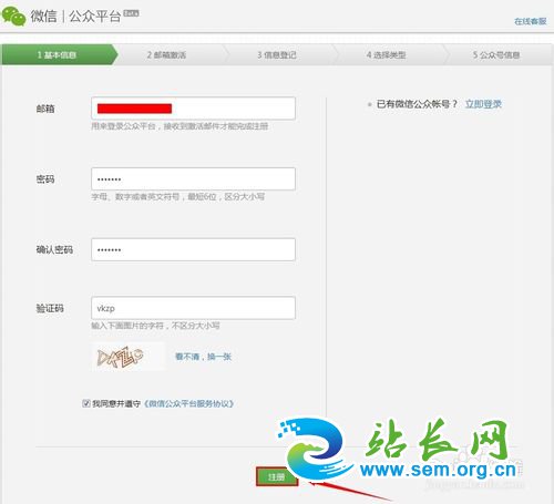 输入你要的邮箱地址,和登陆微信公众平台的密码。点击【注册】